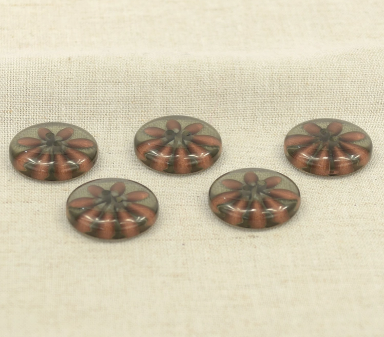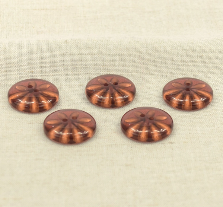 Thick round and domed button. Translucent and colored in sepia shades, there is a sort of daisy nestled in the heart of the button, like natural amber. These pretty original buttons will go perfectly on a heavier cardigan.