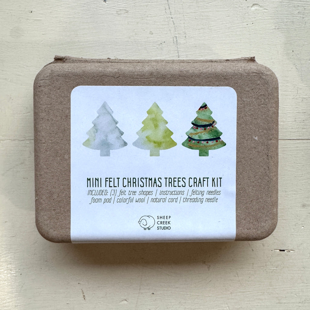 This mini kit is the perfect size for a stocking stuffer, or quick and fun holiday crafting with kids. This is a wonderful project for eye-hand coordination and inspiring creativity. A high quality, approachable Needle Felting Craft Kit, invites beginners & beyond to experience the joy of felting wool. Following simple instructions, add colorful decorations to three beautiful green toned wool tree shapes. When you are finished you can thread yarn through the decorated trees to use as ornaments, table place settings, or gift toppers. A perfect Christmas gift or holiday craft for families.