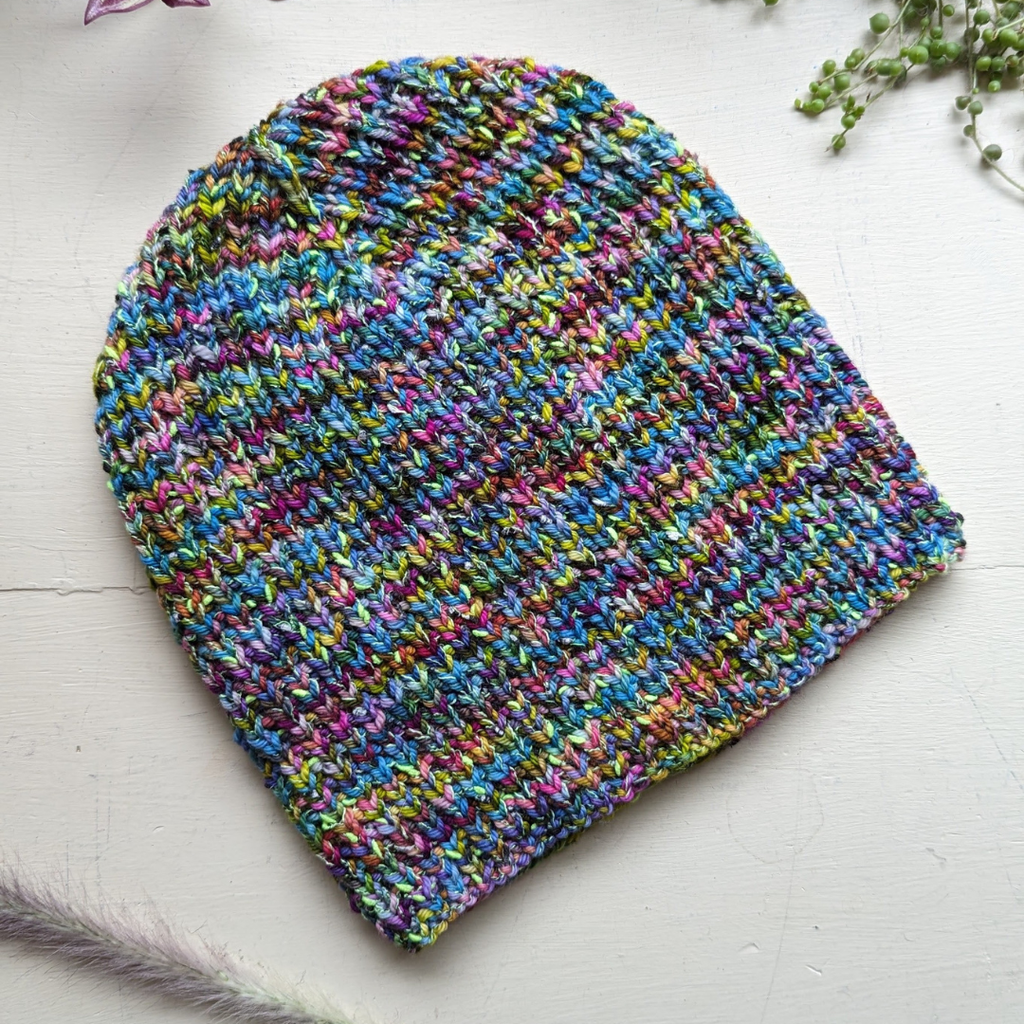 The Autumnal Equinox Hat features an easy stitch pattern that is fun and relaxing to knit. Blending two yarns together - a hand dyed worsted weight superwash wool, and a textured hold-along yarn that adds pops of neon.