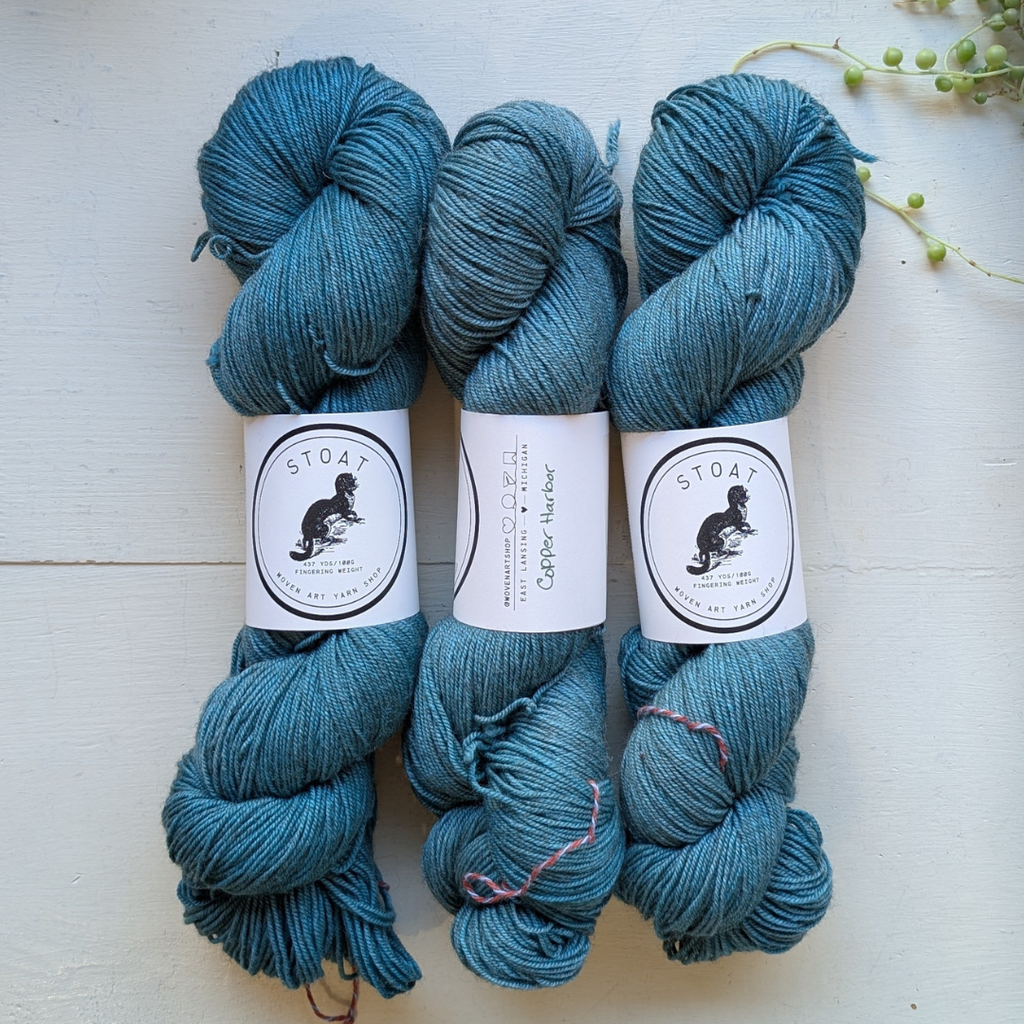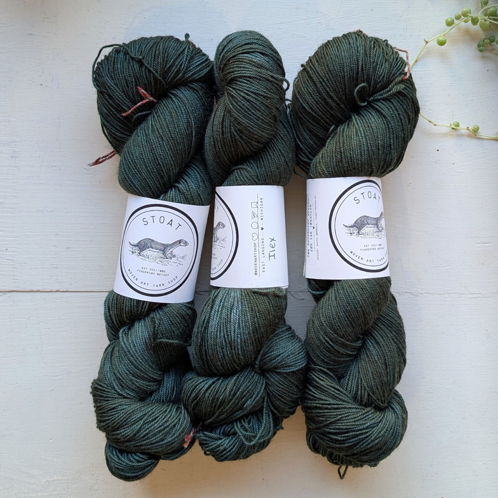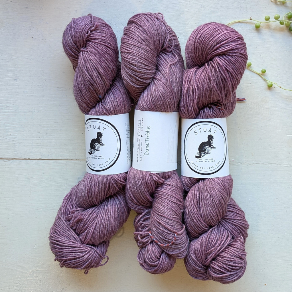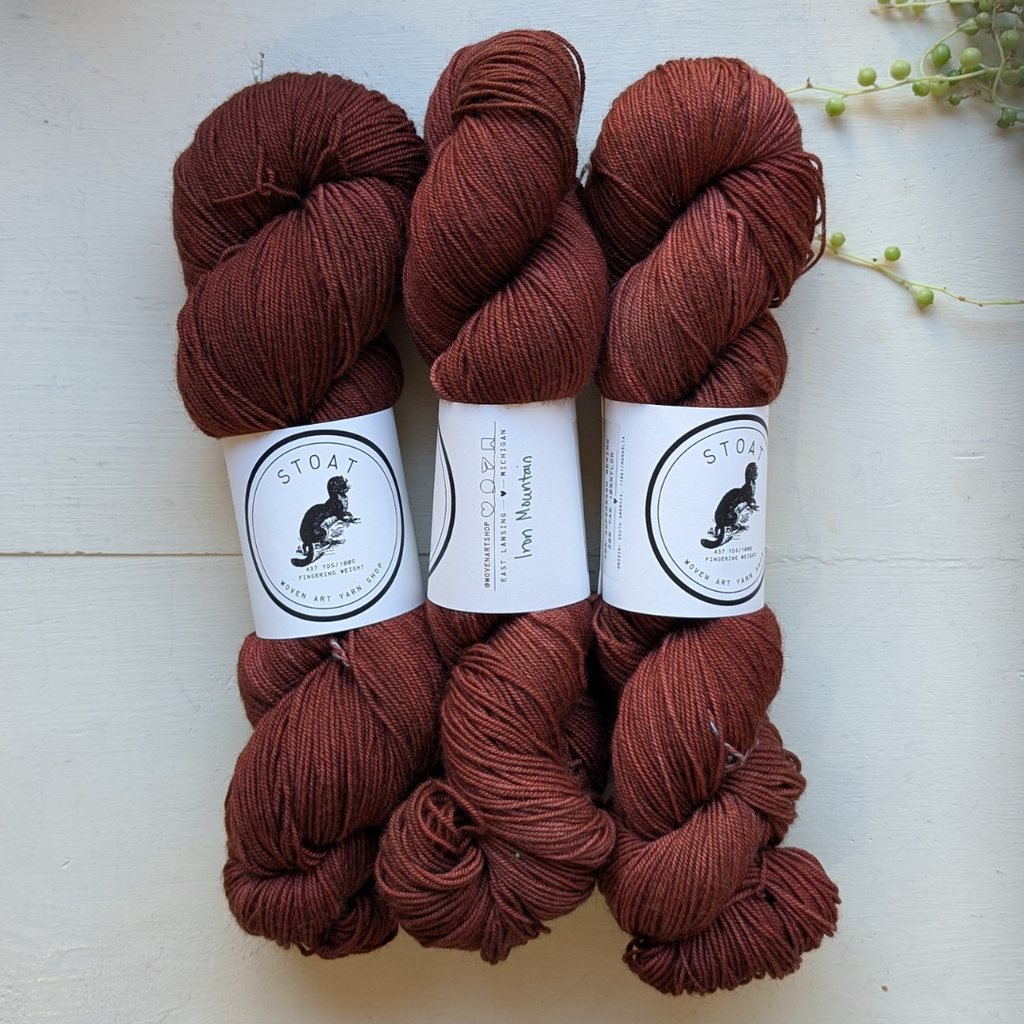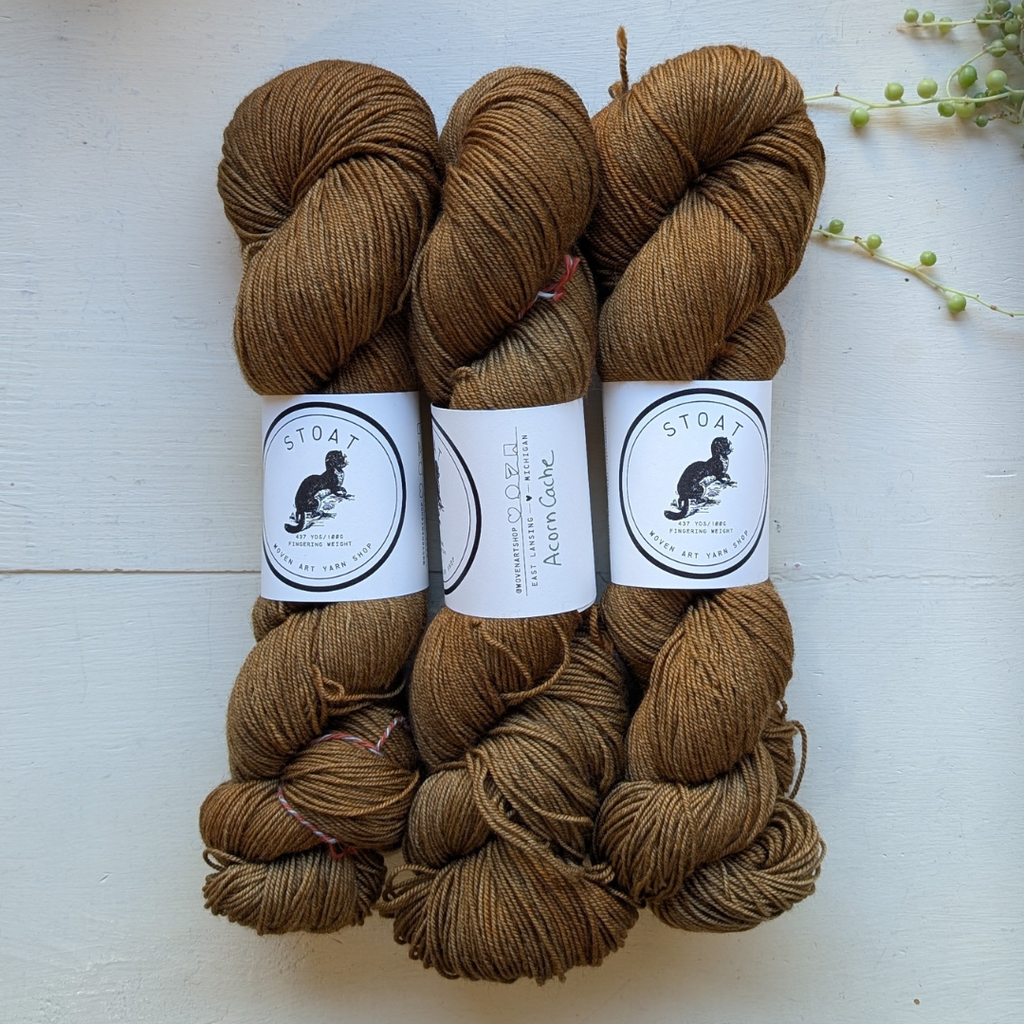 Hand dyed at Woven Art, Stoat is our luxurious fingering weight yarn.