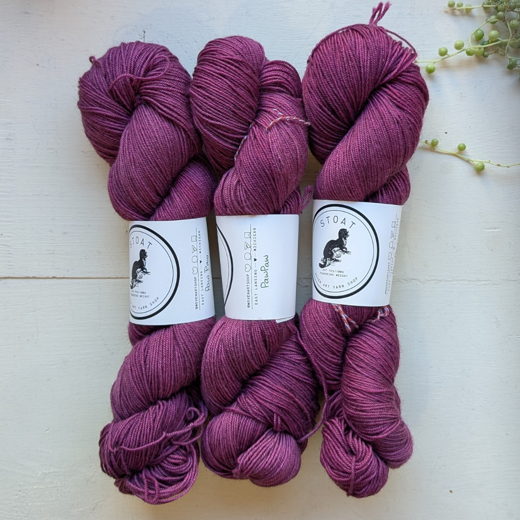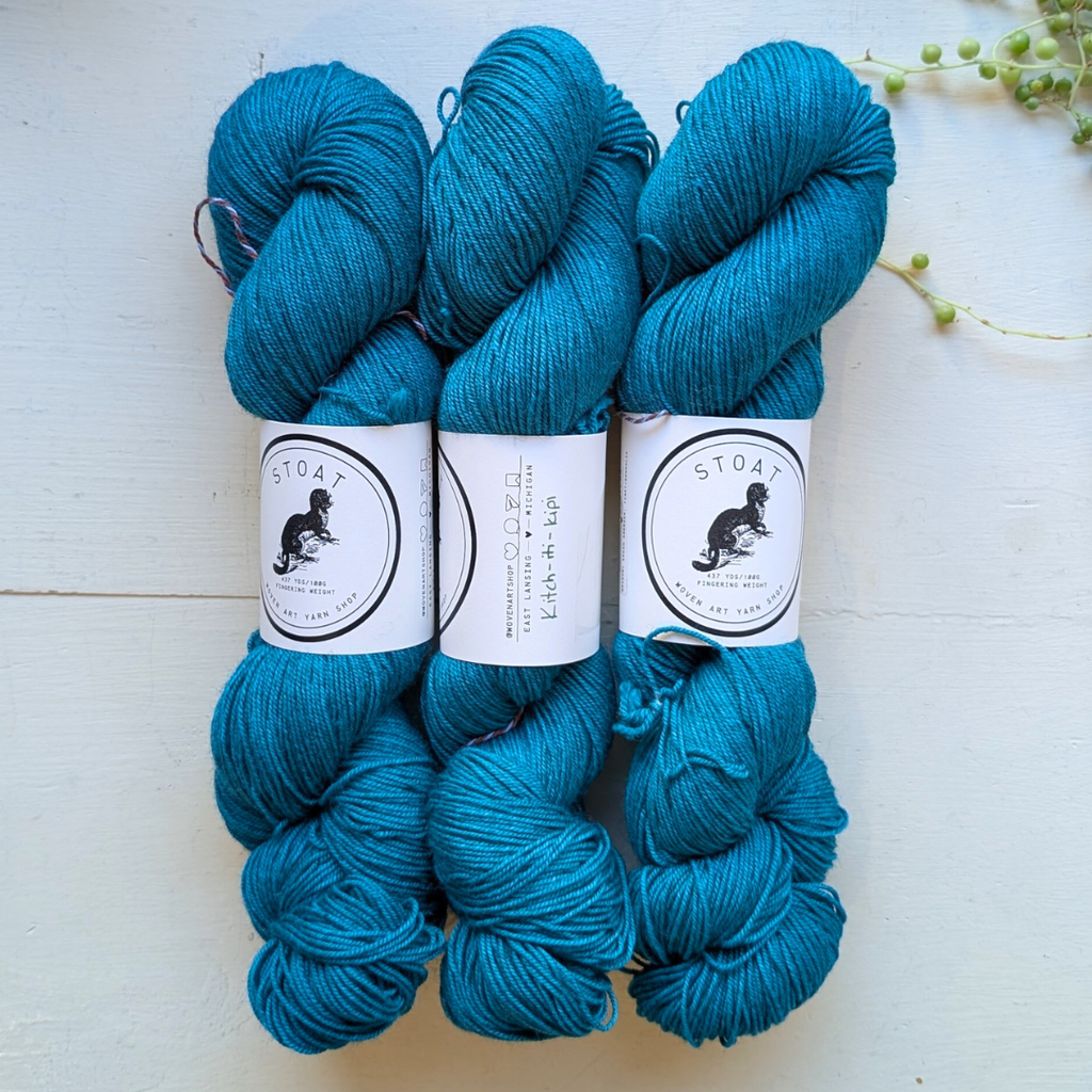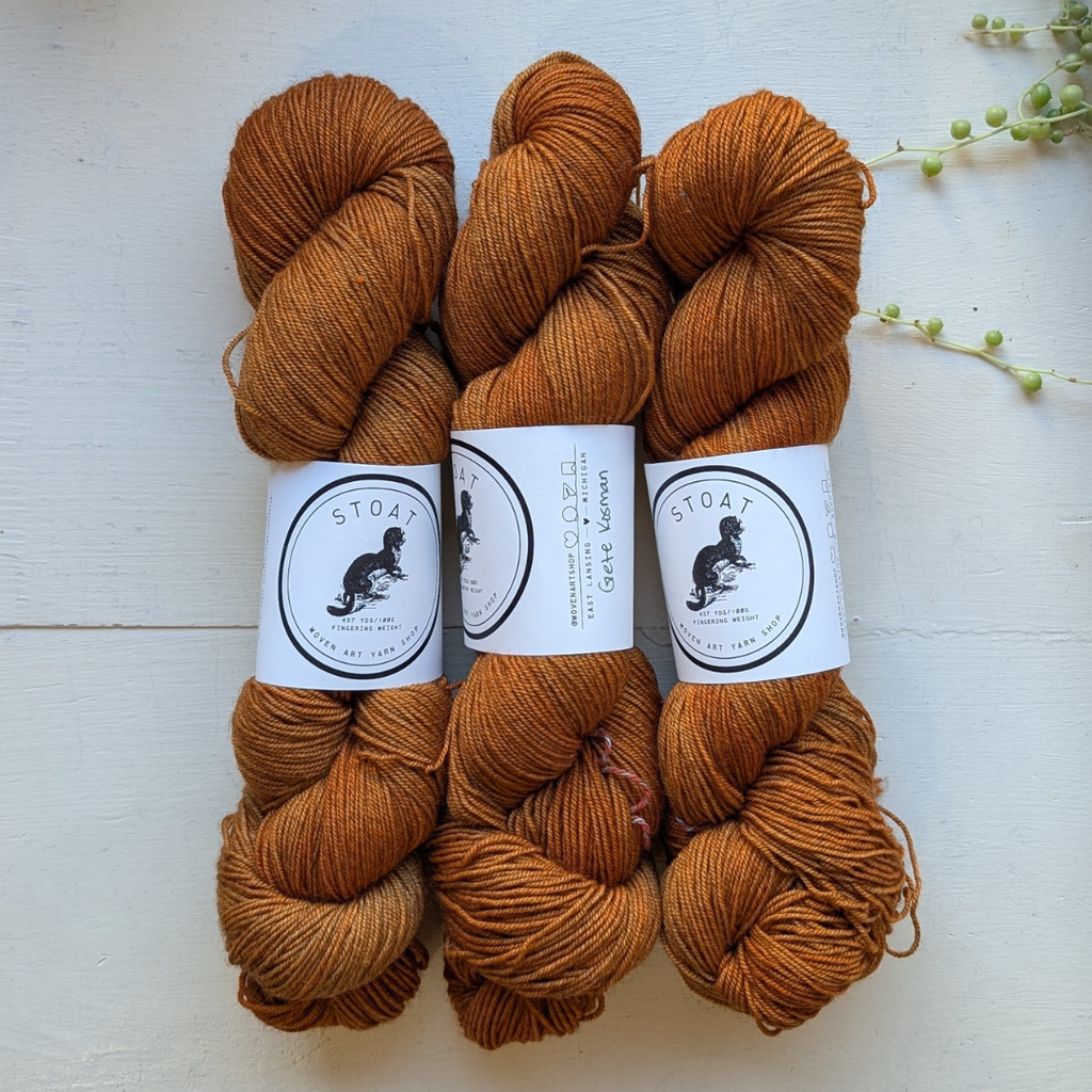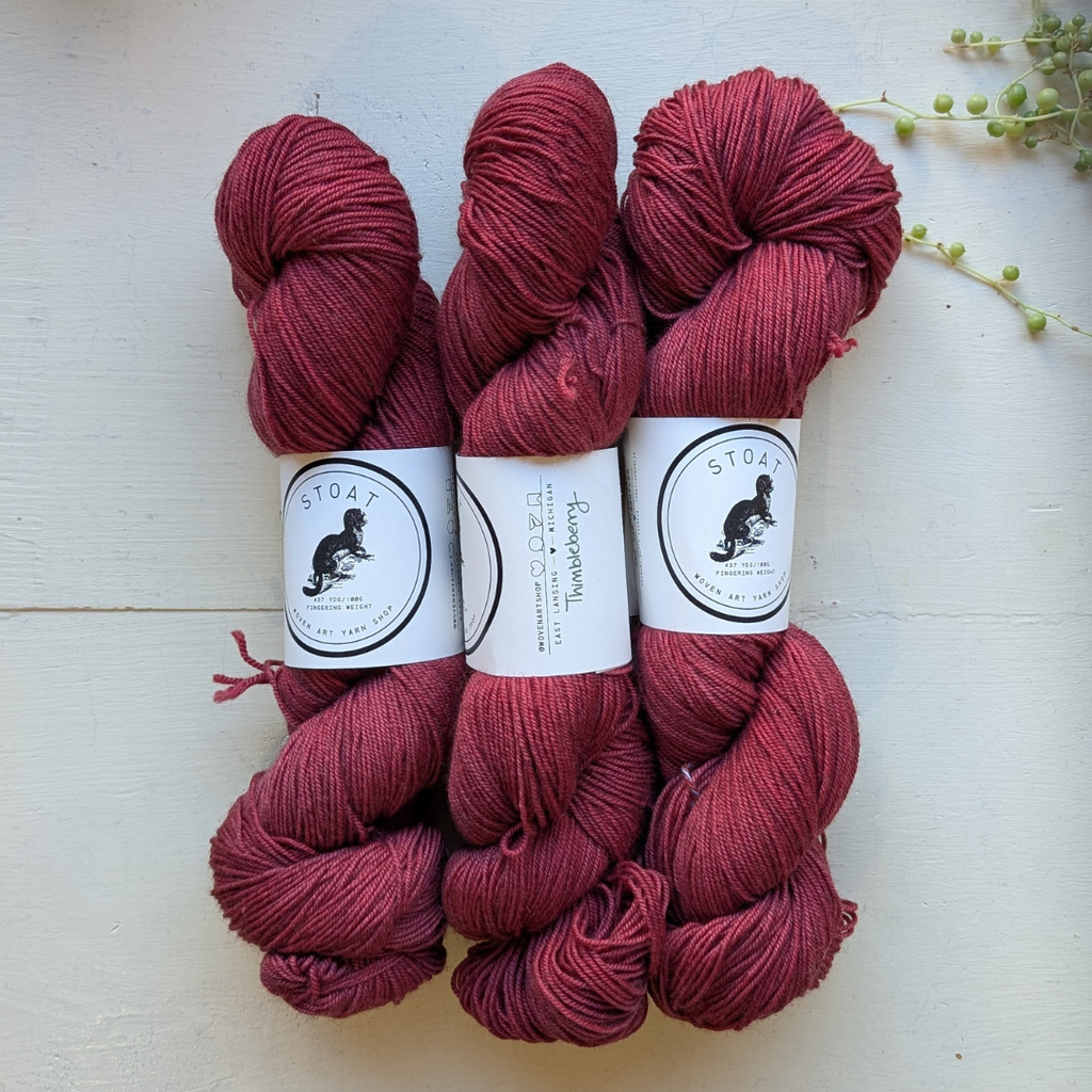 Hand dyed at Woven Art, Stoat is our luxurious fingering weight yarn.