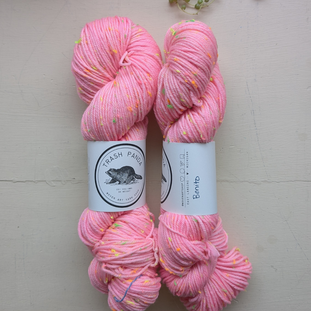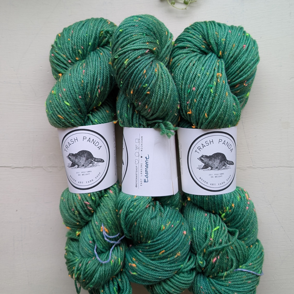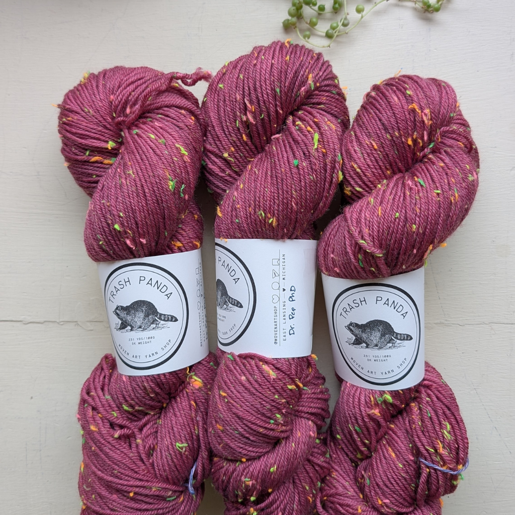 We are pleased to welcome our own hand-dyed yarn! The first base we are releasing is Trash Panda - a chaotic and joyful neon tweed. This DK weight yarn is perfect for sweaters, hats, kids things, and any other item you may want to wear with chaotic joy.